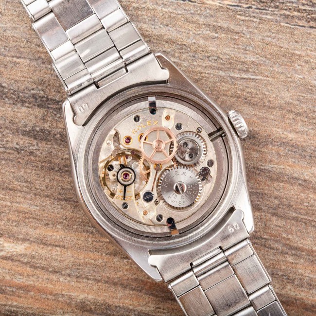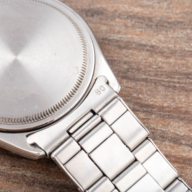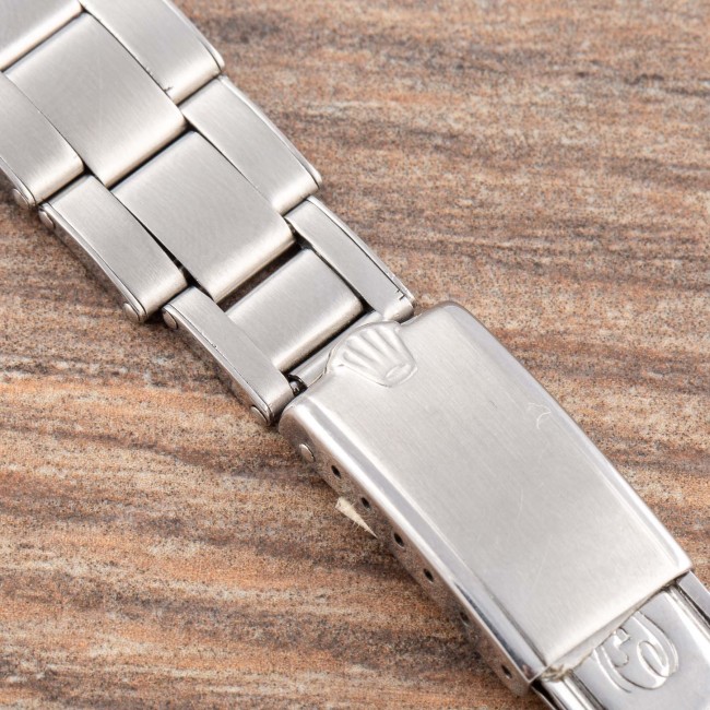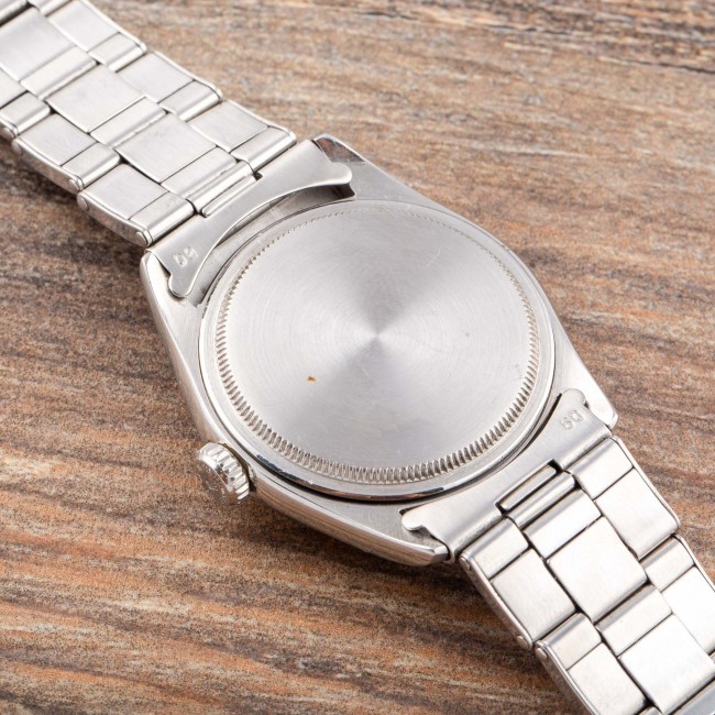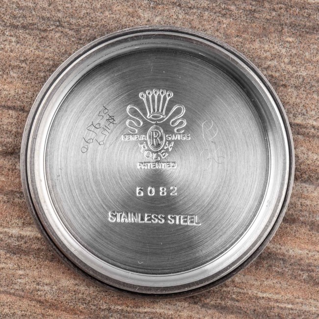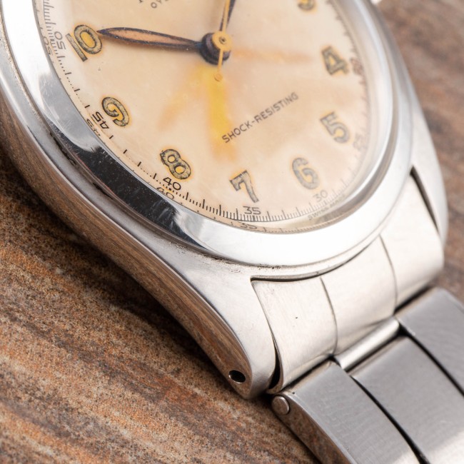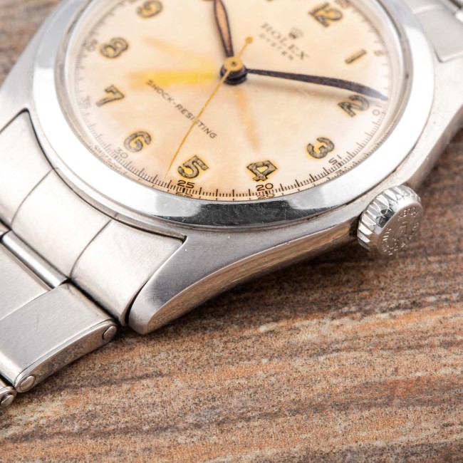 ROLEX OYSTER SHOCK RESISTING REF. 6082 The Rolex Oyster reference 6082 is a rather unusual reference made by Rolex in the 1950s. Its main features are the thin case, in-house hand-wound caliber, Super Oyster crown and screw-down caseback, radium Arabic numerals and hands. This reference was only made for a few years and was an excellent alternative for those looking for an elegant watch with a much thinner case profile than the Rolex "Bubbleback" watches. An unusual feature of the present Rolex Oyster 6082 is the presence of the inscription "Shock - Resisting" at 6 of the clock, to further enhance the resistance of Rolex watches to shocks and impacts. This Rolex Oyster reference 6082 is a very well preserved example of this rare reference. The reference 6082 is a highly desirable vintage Rolex model that with its 34mm case diameter was quite large for the standards of the 1950s. The present example is even more collectible as it bears the inscription "Shock - Resisting" at 6 o’clock, which is a rare occurrence on these watches. The radium on the hands has left a charming light stain on the dial over time, something that is very common on watches with this luminous material on the hands. The overall condition is very good, the dial has a nice vintage patina, the case matches the original shapes, the movement works perfectly. All components are original and correct for the watch including dial, movement, case back, bezel. The watch comes with a later Rolex Oyster bracelet. Year 1952, diameter 34mm, Serial Number 813,XXX.