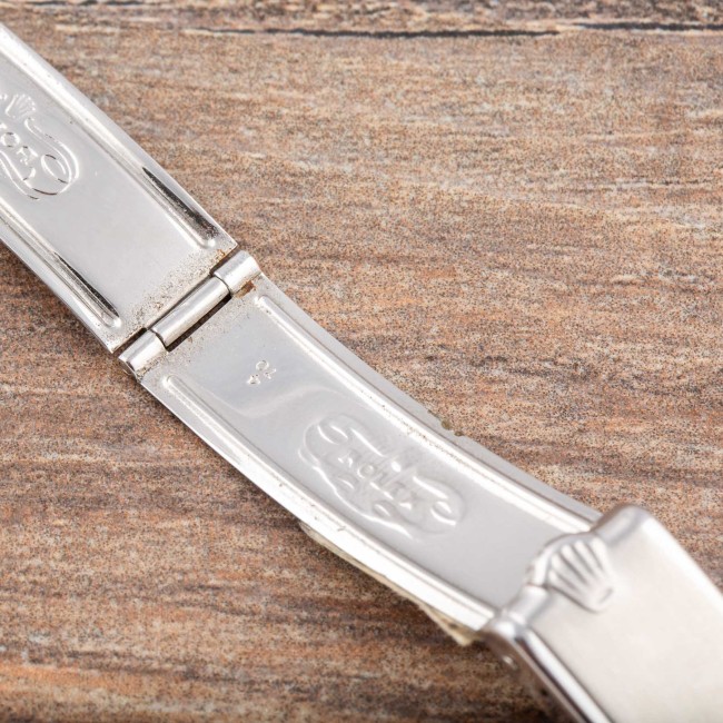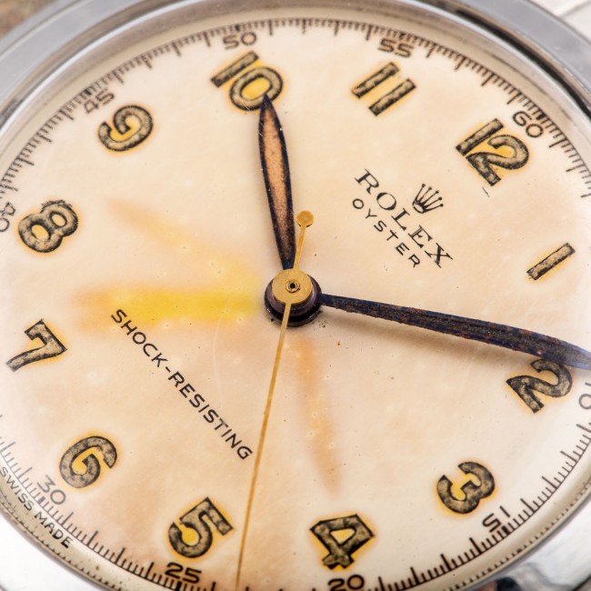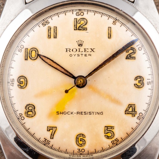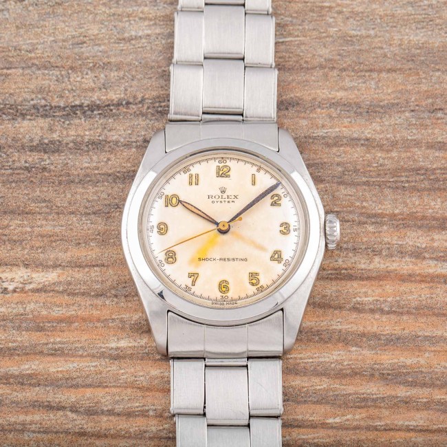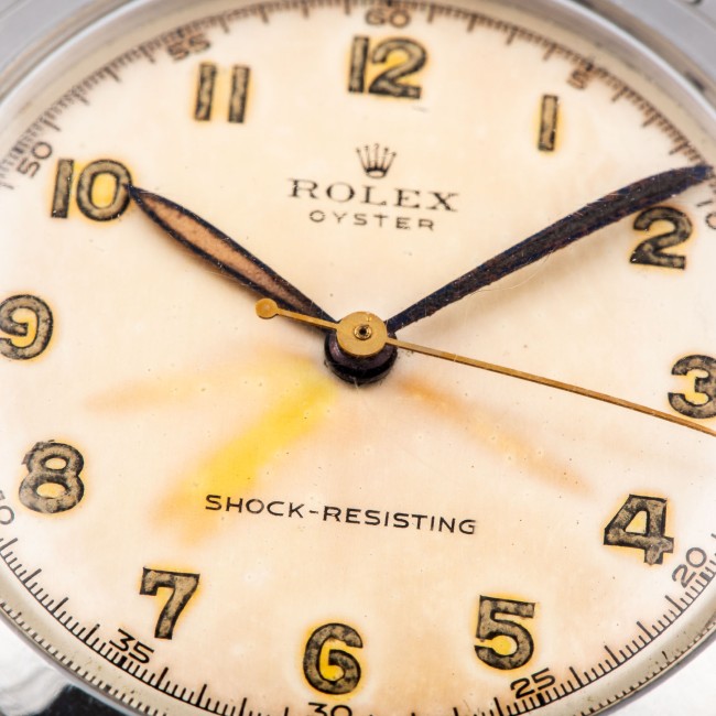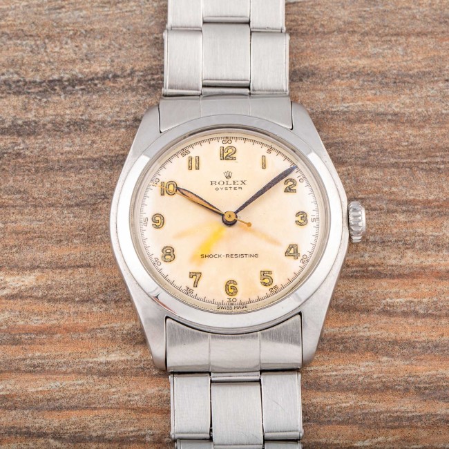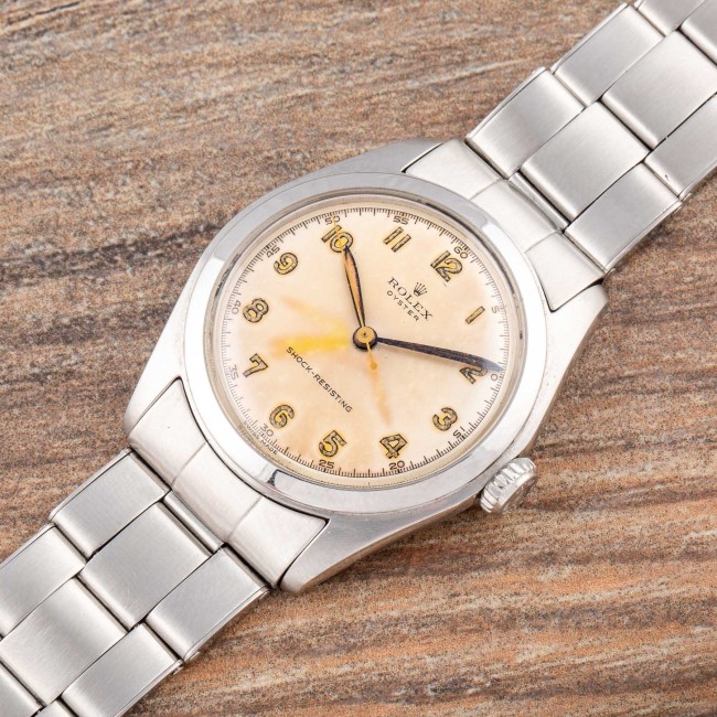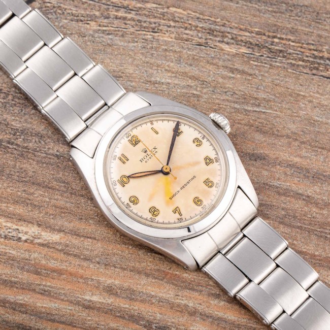 ROLEX OYSTER SHOCK RESISTING REF. 6082 The Rolex Oyster reference 6082 is a rather unusual reference made by Rolex in the 1950s. Its main features are the thin case, in-house hand-wound caliber, Super Oyster crown and screw-down caseback, radium Arabic numerals and hands. This reference was only made for a few years and was an excellent alternative for those looking for an elegant watch with a much thinner case profile than the Rolex "Bubbleback" watches. An unusual feature of the present Rolex Oyster 6082 is the presence of the inscription "Shock - Resisting" at 6 of the clock, to further enhance the resistance of Rolex watches to shocks and impacts. This Rolex Oyster reference 6082 is a very well preserved example of this rare reference. The reference 6082 is a highly desirable vintage Rolex model that with its 34mm case diameter was quite large for the standards of the 1950s. The present example is even more collectible as it bears the inscription "Shock - Resisting" at 6 o’clock, which is a rare occurrence on these watches. The radium on the hands has left a charming light stain on the dial over time, something that is very common on watches with this luminous material on the hands. The overall condition is very good, the dial has a nice vintage patina, the case matches the original shapes, the movement works perfectly. All components are original and correct for the watch including dial, movement, case back, bezel. The watch comes with a later Rolex Oyster bracelet. Year 1952, diameter 34mm, Serial Number 813,XXX.