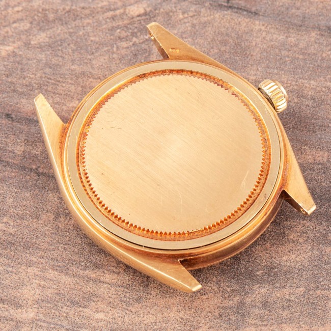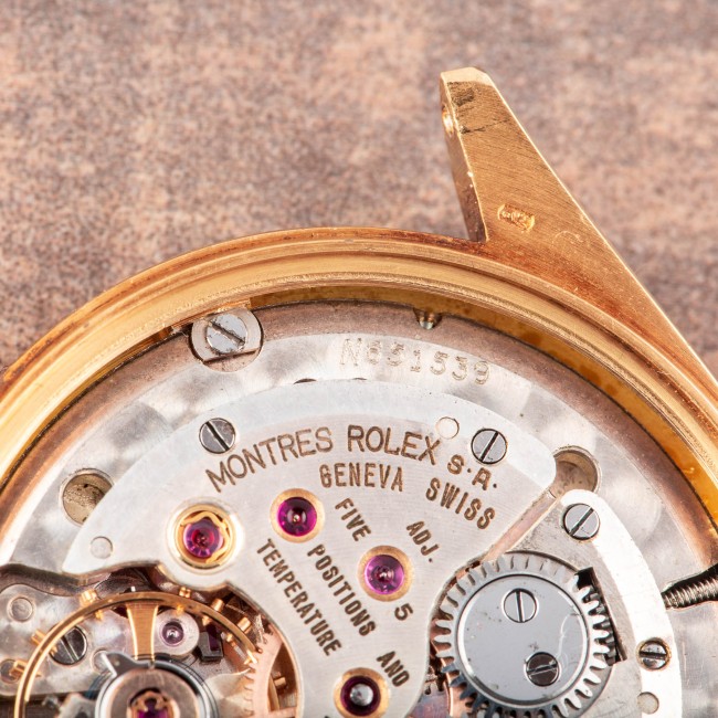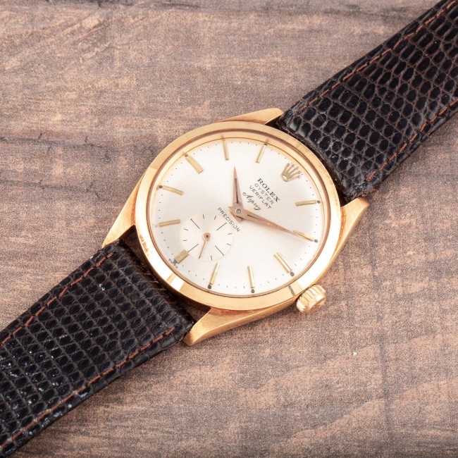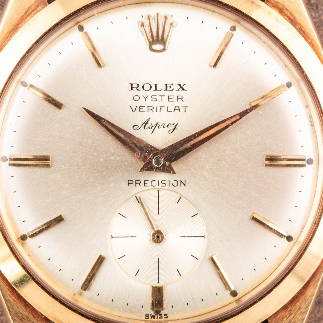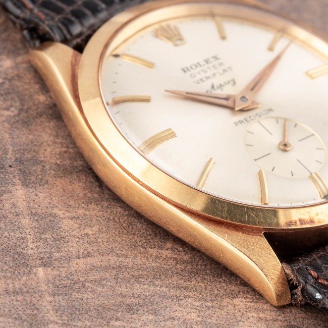 ROLEX VERIFLAT REF. 6512 “ASPREY” The Rolex Veriflat ref. 6512 is a remarkable timepiece designed to embody elegance and refinement with its ultra-thin case. The reduced thickness of the middle case is achieved through a clever knurling technique on the caseback, resulting in a completely flat surface. The movement used in the Veriflat is a unique variation of the cal. 1030, known as the cal. 1000, featuring a small seconds counter at 6 o'clock. The manually-wound movement was chosen to maintain the slim profile, as an automatic module would have added height and prevented the use of a flat case back. Rolex successfully achieved a remarkably thin movement, measuring only 3.45mm in thickness. Following the release of the Rolex Veriflat, around the early 1960s, the brand did not venture into similar creations, making the ref. 6512 the thinnest Rolex Oyster ever produced. The Rolex Veriflat is already a highly sought-after and rare timepiece, but the one we have here is truly exceptional as it was sold by Asprey. This watch possesses all the correct features that a Rolex retailed by Asprey during this period should have. The Asprey signature is prominently stamped on the dial below the Veriflat script. The caseback, signed with "6512," shows some signs of aging, but all Asprey markings are accurate, including the double RWC Ltd engraving, hallmarks, and the repeated serial number that matches the one engraved between the lugs. The overall condition is exceptionally good; the dial is flawless, the caliber operates perfectly, the caseback closes seamlessly, and the case still retains its original factory finishes. Over the years, it has acquired some beautiful oxidation, further confirming the exceptional quality of this timepiece. Serial Number 692,XXX, Year 1961, Diameter 34mm.
